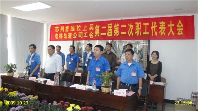 2009年10月23日,苏州塞维拉上吴电梯轨道系统有限公司工会第二届第二次职工代表大会在上吴公司隆重召开,出席大会的上级工会领导有吴江工会副主席卞志良,吴江劳工部部长王松坤,吴江维保部部长马云生,汾湖镇工会常务副主席周彩萍。出席本次会议的公司领导有上吴公司总经理蔡连生,上吴公司运营总监邹征,上吴公司工会主席朱勤根,副主席沈根华以及各部门主要领导。